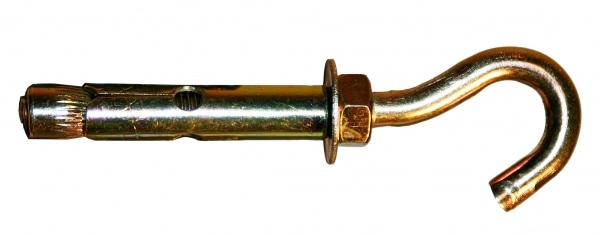 Анкерный болт с крюком – это крепежное изделие, применяемое для монтажа навесных конструкций. Закрепляется в бетонном, каменном или кирпичном основании. Распорная часть анкерного болта состоит из трубки и штока. Монтируется ударом молотка по штоку, после расклинивания его с трубчатой части снимается гайка, фиксирующая навесной предмет. Манжета вокруг трубки не позволяет болту слишком глубоко уходить в отверстие. Из-за трубчатой конструкции изделие не предназначено для больших нагрузок, зато идеально подходит для бытовых нужд.