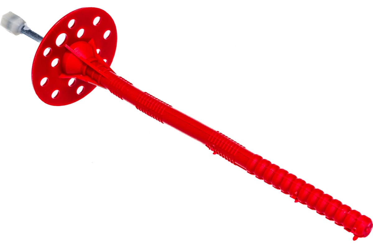 Применяется для крепления теплоизоляционных материалов к бетону, полнотелому и пустотелому кирпичу, камню, пенобетону. Представлен в виде дюбеля с двухсегментной распорной частью из ударопрочного полипропилена с увеличенной прижимной шайбой диаметром 60 мм и металлическим оцинкованным гвоздем с потайной головкой. Используется при монтаже тяжелых видов утеплителя или утеплителя большой толщины. Шляпка дюбеля способствует надежному удержанию материала теплоизоляции, препятствуя прорыву в месте крепления. Установка производится методом сквозного монтажа. В среднем на 1 кв. м. теплоизоляции требуется 5-6 дюбелей.