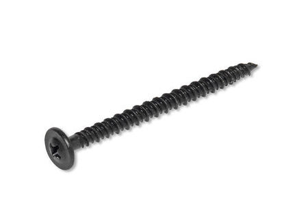 Металлический самонарезающий шуруп с плоской прижимной шляпкой, крестообразным шлицем PH2 и острым концом. Имеет антикоррозионное покрытие черного фосфатирования и двухзаходную резьбу разного диаметра и прижимную шляпку.
