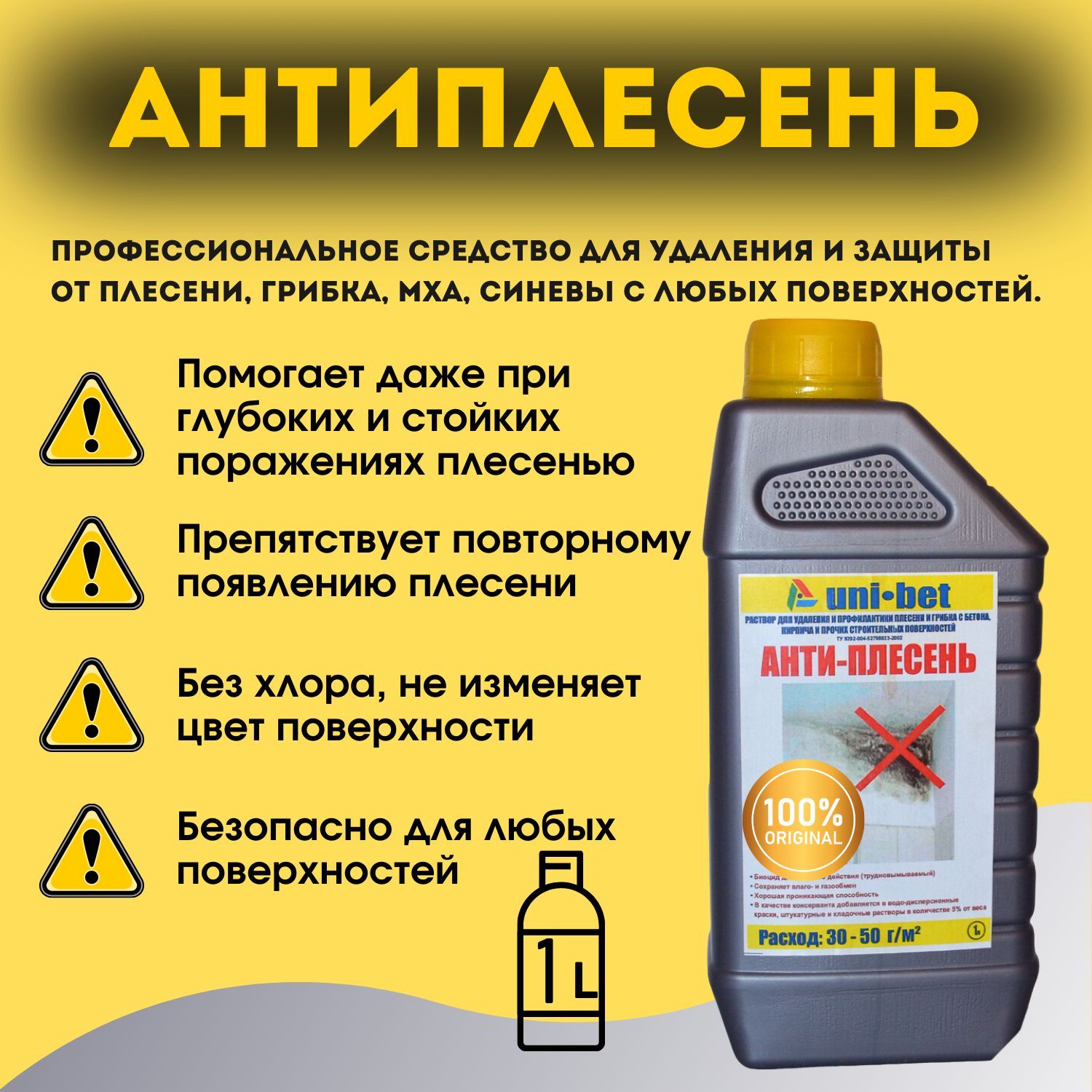 Антиплесень применяется для наружных и внутренних работ по (бетону, кирпичу и пр.). Применяется для уничтожения всех видов микроскопического грибка (плесени), в том числе споровых форм, сине-зеленых водорослей мхов, лишайников, бактерий.