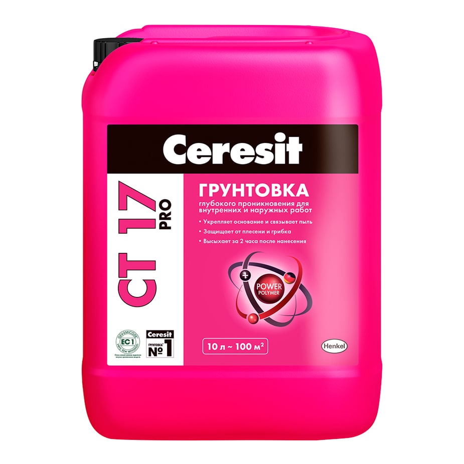 Грунтовка CT 17 PRO предназначена для обработки поверхностей перед нанесением штукатурных и напольных смесей, плиточных клеев и т.д.