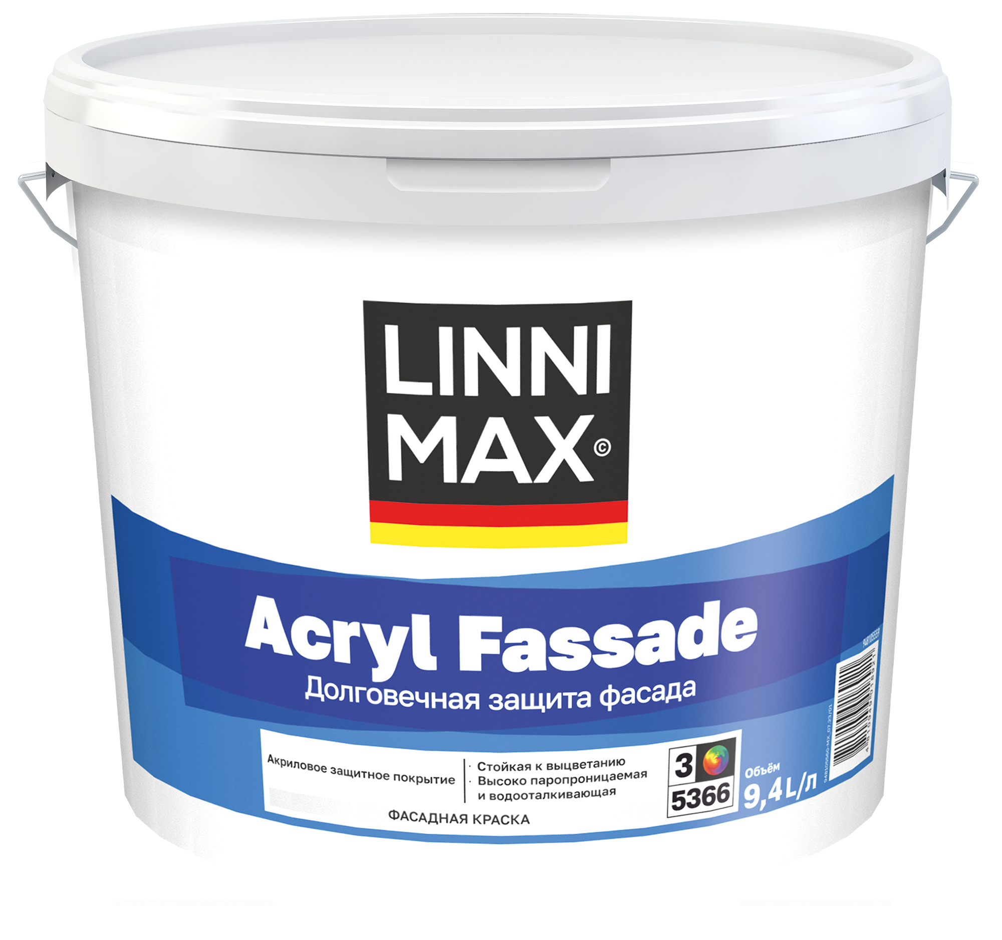Краска в/д для наружных работ LINNIMAX Acryl Fassade /Акрил Фассад Б1,10 л — это высококачественное покрытие для наружных работ, созданное на основе акриловых смол. Благодаря своим свойствам, оно обеспечивает надёжную защиту фасадов зданий от атмосферных воздействий, ультрафиолетового излучения и перепадов температур.