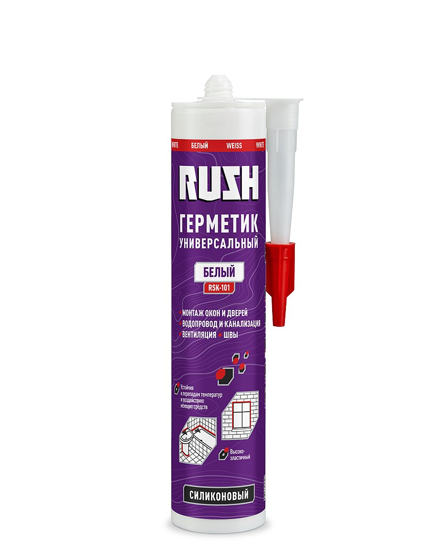 Высококачественный универсальный силиконовый герметик RUSH® с системой отверждения ацетокси применяется в общих бытовых, ремонтных и строительных работах. Предназначен для уплотнения, соединения и защиты непористых поверхностей от проникновения воздуха и влаги; для герметизации оконных рам, дверных коробок, кабельных каналов; герметизации стыков при монтаже сантехнического оборудования, систем кондиционирования воздуха; защиты полиуретановой монтажной пены от УФ-лучей. Характеризуется отличной адгезией к нержавеющей стали, анодированному алюминию, стеклу, керамической плитке, пропитанной или лакированной древесине, эпоксидной смоле, ламинату, большинству красок, многим пластикам, таким как полиэстер, полиакрилат. Быстро покрывается плёнкой. Устойчив к воздействию большинства моющих и чистящих средств, стоек к УФ-излучению, атмосферным воздействиям, температурным перепадам и практически любым агрессивным средам. Тиксотропный, не растекается и не сползает по шву. Преимущества: Устойчив к УФ-излучению, воздейст