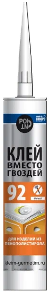 КЛЕЙ ВМЕСТО ГВОЗДЕЙ для пенополистирола - монтажный клей на основе стироло- акриловой дисперсии. Без растворителей. Приклеивает внутри и снаружи помещений изделия из легких материалов (пенополистирола , картона, пробки, древесины) к пористым основаниям бетону, кирпичу, гипсу, штукатурке, древесине. Быстрое и сильное начальное схватывание. Особенности:
