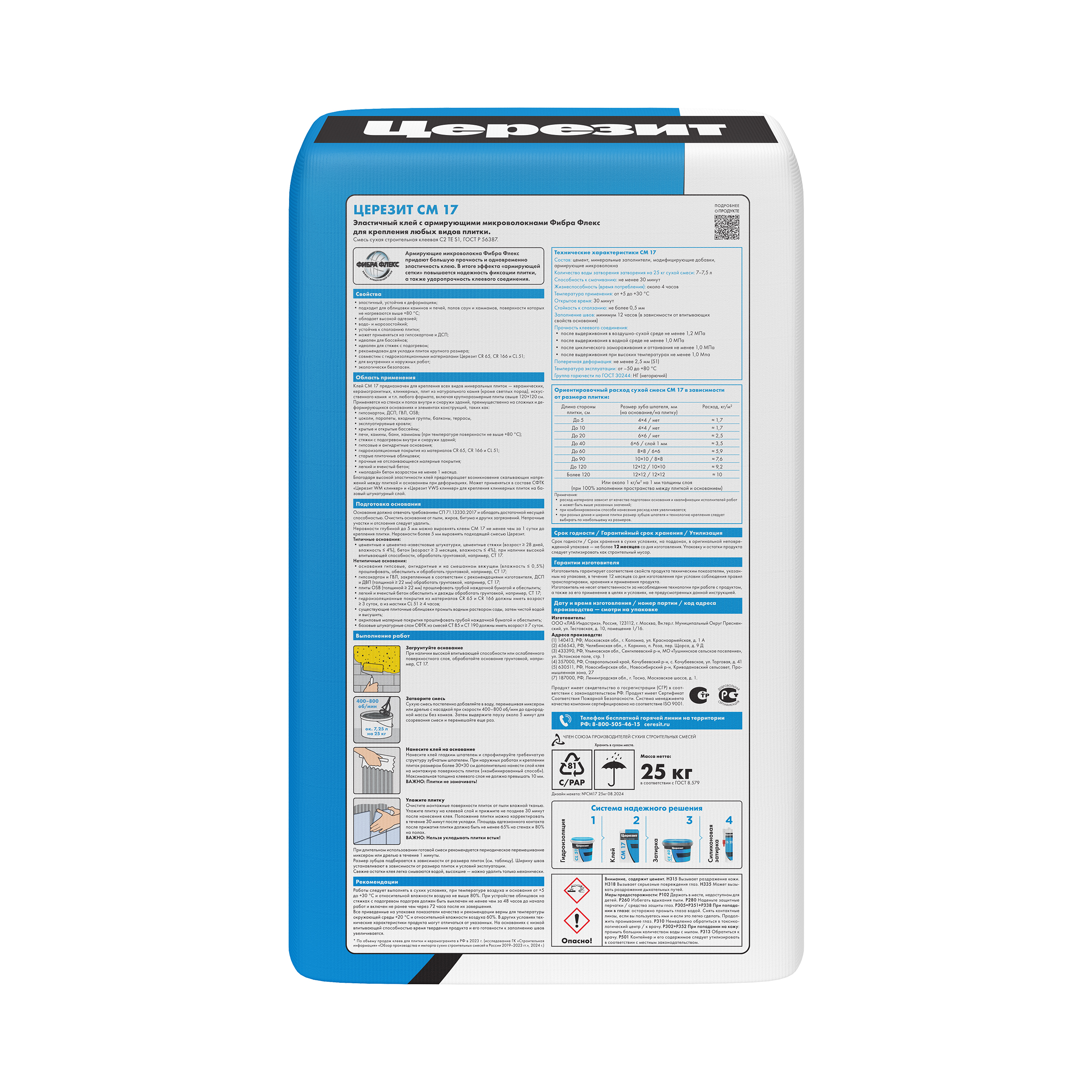 СМ 17/25 ЦЕРЕЗИТ Эластичный клей C2TES1 с армирующими волокнами для любых видов плитки 25кг (48 шт)
