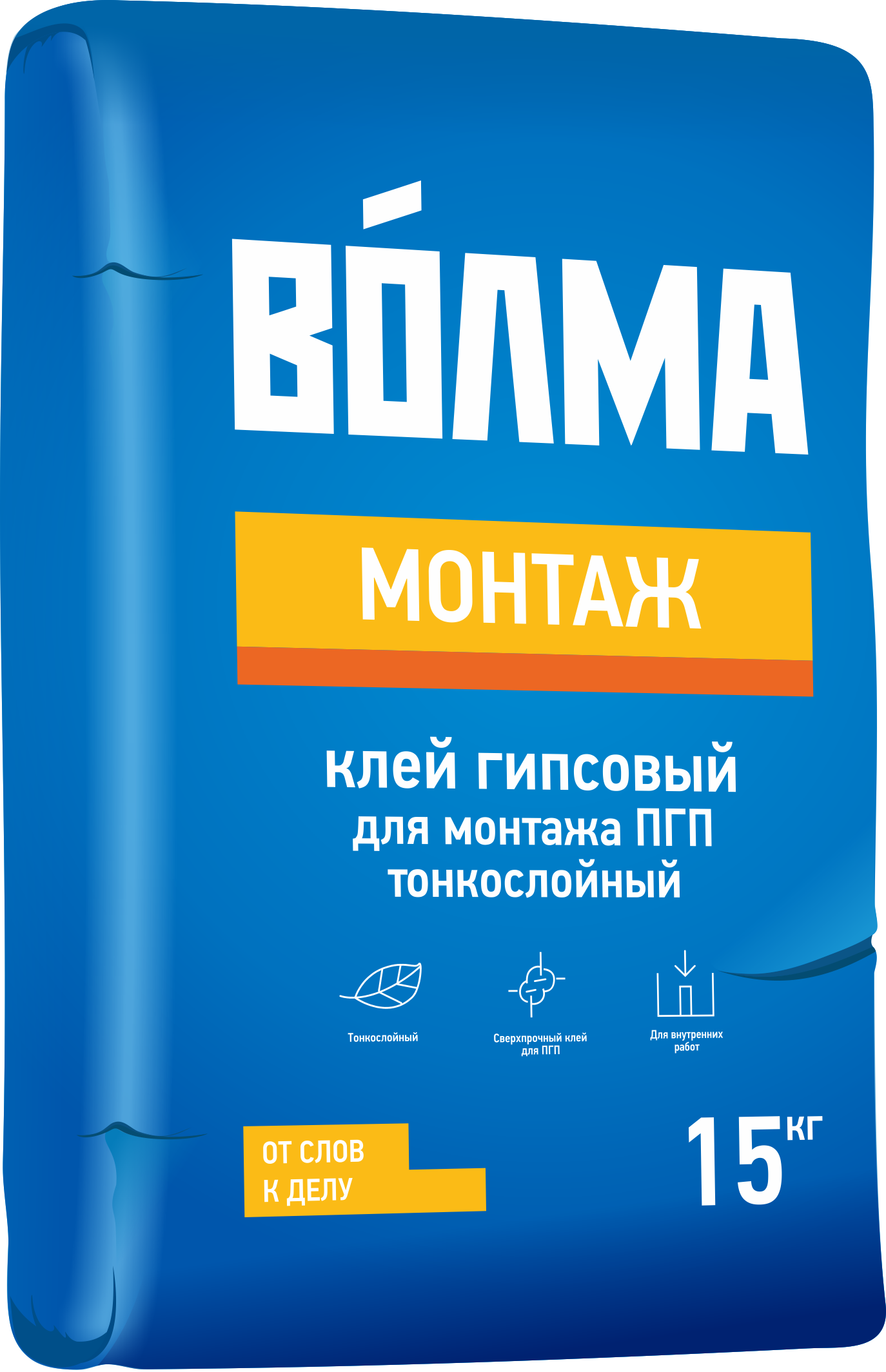 «ВОЛМА-Монтаж» – сухая монтажная смесь на основе гипсового вяжущего, модифицированная минеральными и химическими добавками, обеспечивающими высокую адгезию, водоудерживающую способность, оптимальное время работы.Область применения:Для монтажа перегородок из гипсовых пазогребневых плит, крепления гипсовых элементов, для бескаркасного монтажа гипсокартонных и гипсоволокнистых листов (ГКЛ, ГВЛ), листов теплоизоляции к вертикальным поверхностям.«ВОЛМА-Монтаж» применяется внутри помещений с нормальной влажностью и температурой от +5 до +30ºС