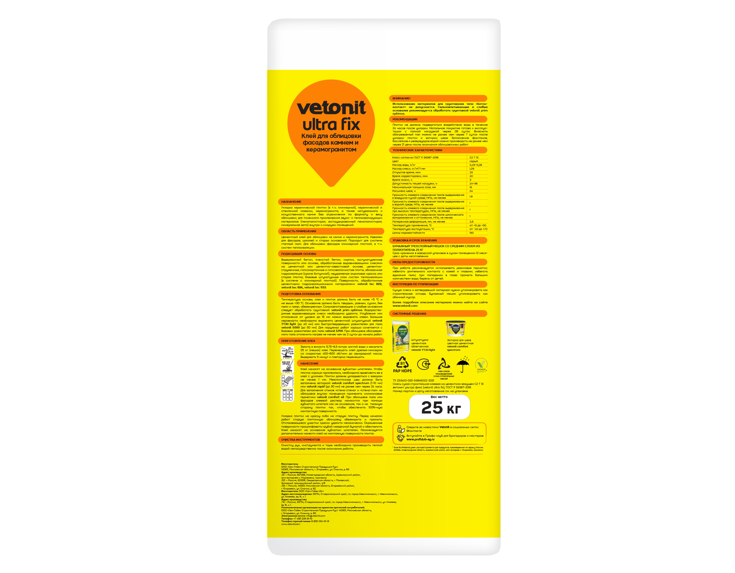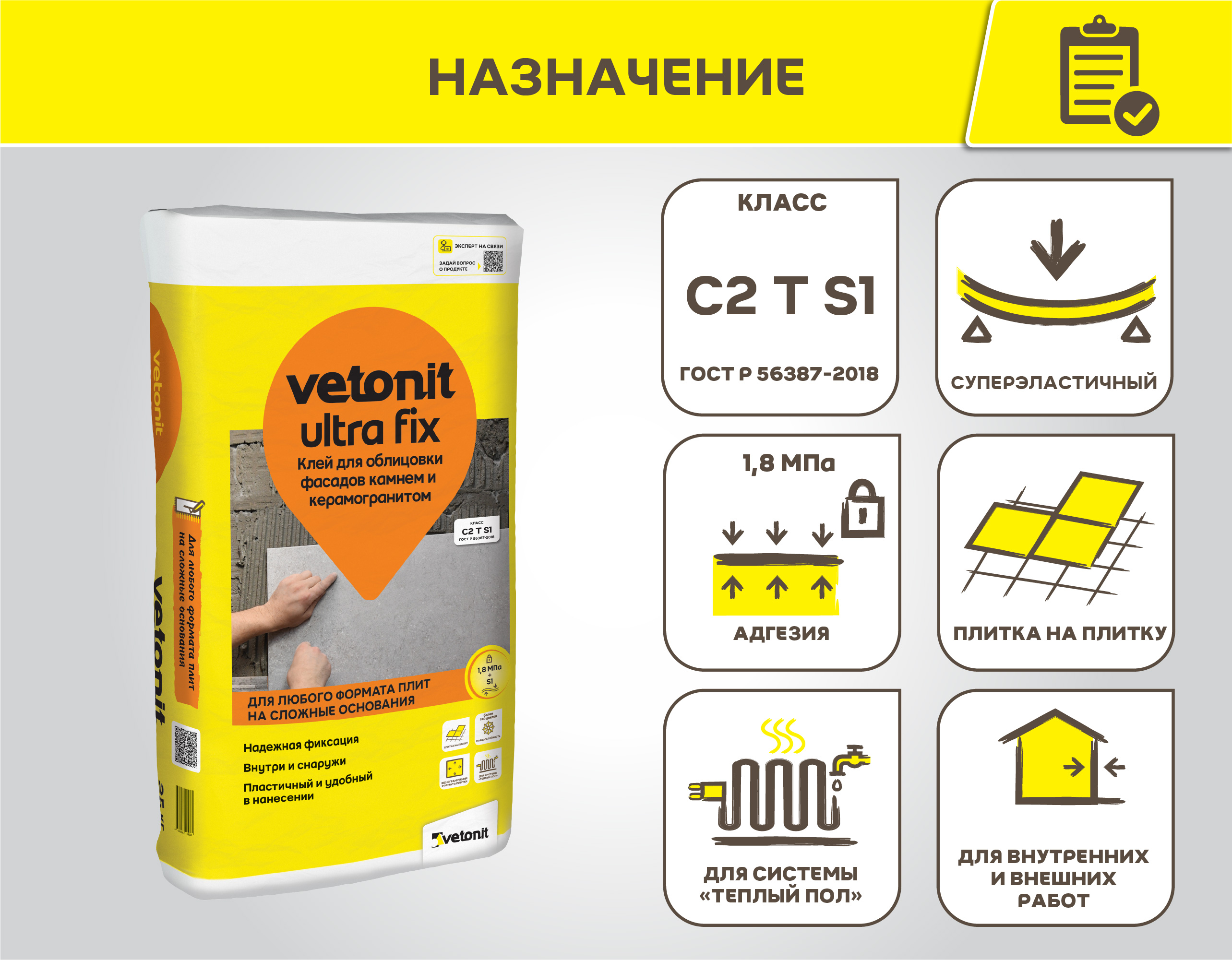 Vetonit Ultra Fix - клей для облицовки фасадов камнем и керамогранитом класса C2 T S1. Подходит для стен и пола, для наружной облицовки. Рекомендован для облицовки фасадов клинкерной плиткой. Поперечная деформативность позволяет работать с плиткой без ограничений формата - плитка особо большого размера или с разницей сторон 1/2 и более. Нивелирует вибронагрузки и динамические нагрузки - подходит для зон с повышенным трафиком: входные группы, общественные помещения.