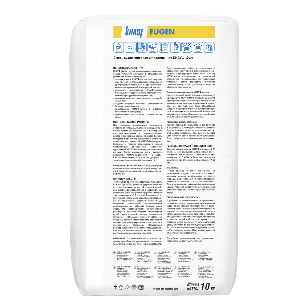 Сухая шпаклевочная смесь на основе гипса с полимерными добавками.Применение.Предназначена для:заделки стыков гипсокартонных КНАУФ-листов (ГКЛ), имеющих утонённую и полукруглую утонённую кромку, с использованием армирующей ленты. заделки трещин и других возможных повреждений гипсокартонных КНАУФ-листов (ГКЛ).тонкослойного шпаклевания плоских бетонных и оштукатуренных поверхностей.заполнения стыков сборных бетонных элементов.монтажа и заделки стыков гипсовых пазогребневых плит.приклеивания к ровной поверхности гипсокартонных листов и комбинированных панелей.склеивания и шпаклевания гипсовых элементов.для внутренних работ.Преимущества.Шпаклевка гипсовая КНАУФ-Фуген разработана специально для заделки стыков гипсокартонных КНАУФ-листов (ГКЛ).Не трескается и не дает усадки.Материал изготовлен из экологически чистого природного минерала (гипса) и не содержит вредных для здоровья человека веществ.Технические характеристикиРасход:при заделке стыков ГКЛ: 0,25 кг/м2.при сплошном шпаклевании, на каждый 1 мм