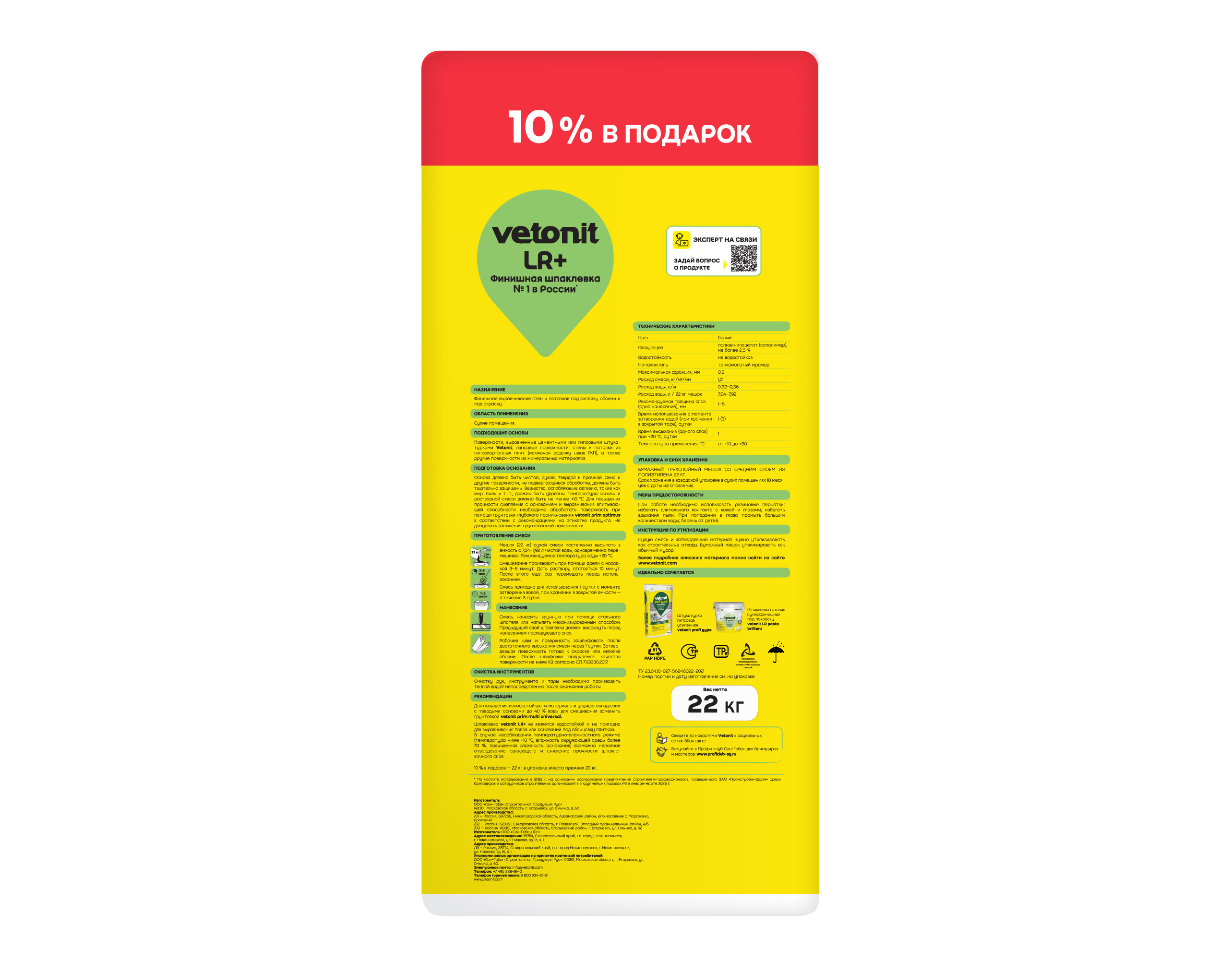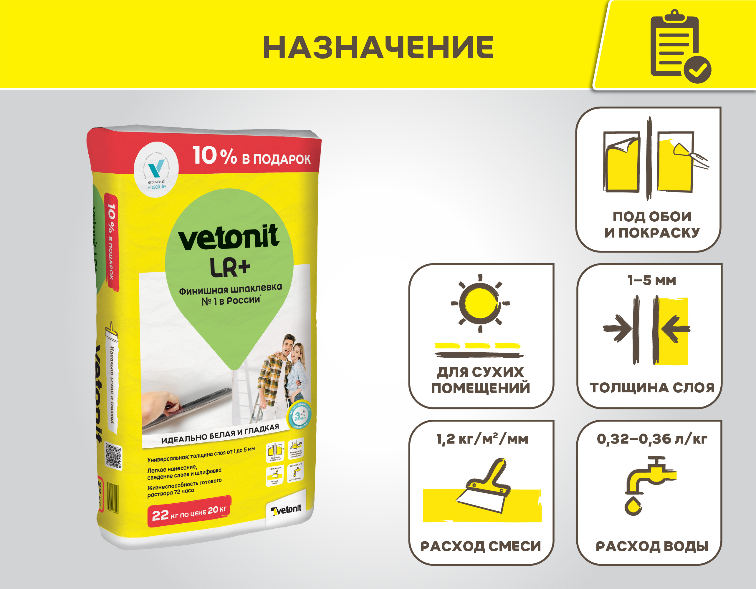 weber. vetonit LR+ - полимерная финишная шпаклевка предназначена для выравнивания поверхностей в сухих помещениях перед оклейкой обоями, покраской, отделкой декоративной штукатуркой. Ее сверхпластичность позволяет быстро, экономно, качественно выравнивать стены и потолки. Слои сводятся между собой идеально. Время работы с затворенной смесью до 72 часов. Покрытие через 24 часа готово к шлифовке.