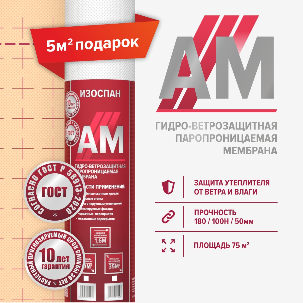 Изоспан AМ обладает водоупорностью, необходимой для защиты утеплителя и других внутренних элементов конструкций здания от подкровельного конденсата и атмосферных осадков, проникающих под внешнее покрытие (кровлю / наружную обшивку), при этом является паропроницаемым материалом, поэтому не препятствует выходу водяных паров из утеплителя в вентилируемый зазор. Гидро-ветрозащитная мембрана Изоспан AМ препятствует конвективному движению воздуха через теплоизоляцию, снижая теплопотери. Прочность материала способствует устойчивости к механическим нагрузкам и атмосферным воздействиям на этапе монтажа и в процессе эксплуатации.