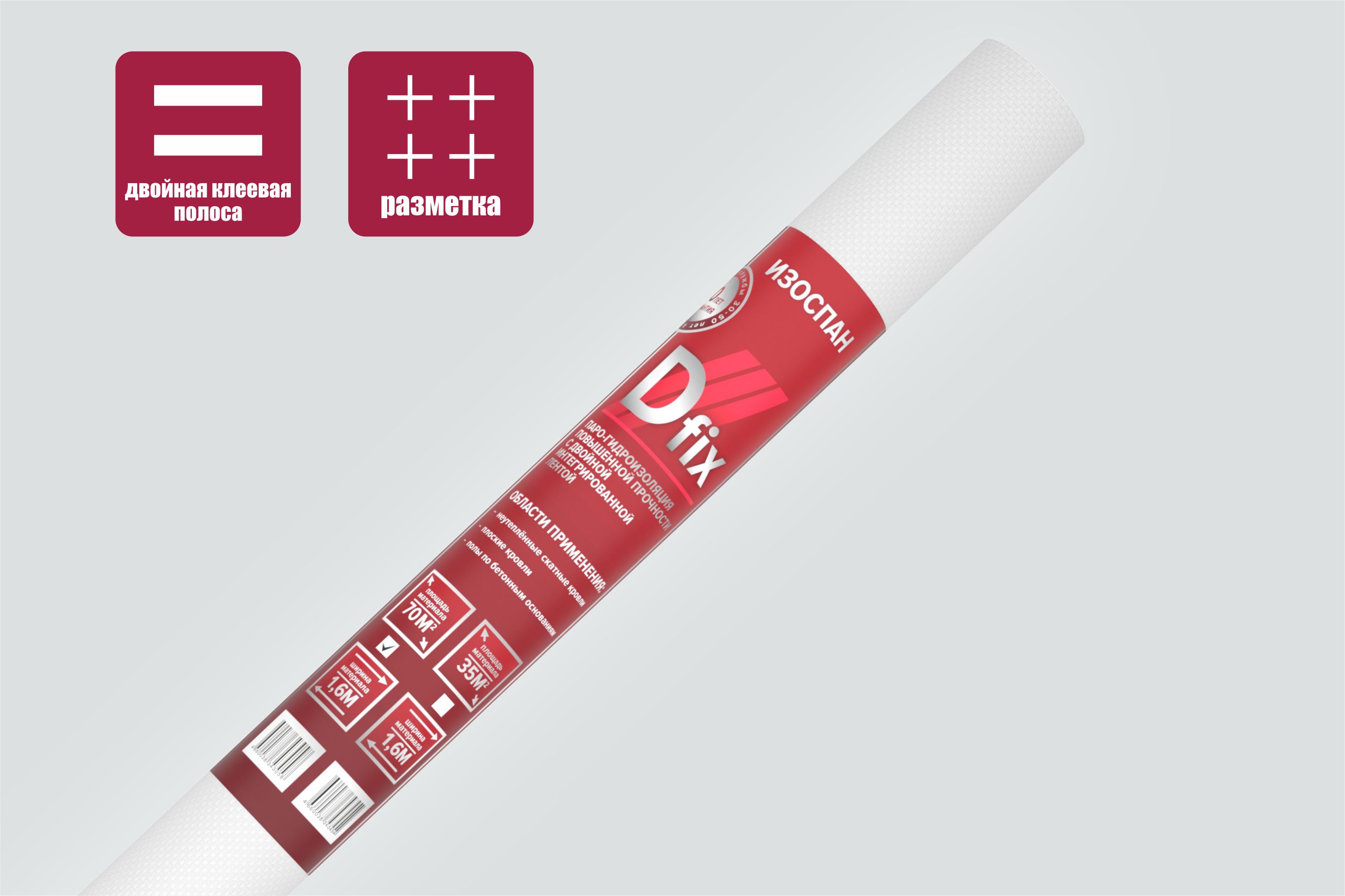 Описание: Изоспан D fix — двухслойный материал, выполненный из высокопрочного полипропиленового тканого полотна и полипропиленовой плёнки. На полотно материала нанесены две клейкие ленты для герметизации нахлёстов.